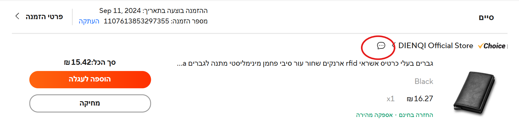 מיד לאחר ביצוע ההזמנה, לוחצים על אייקון הצ’אט (תיבת השיח) שמופיע ליד שם החנות, וכך נפתח צ’אט ישיר עם המוכר.